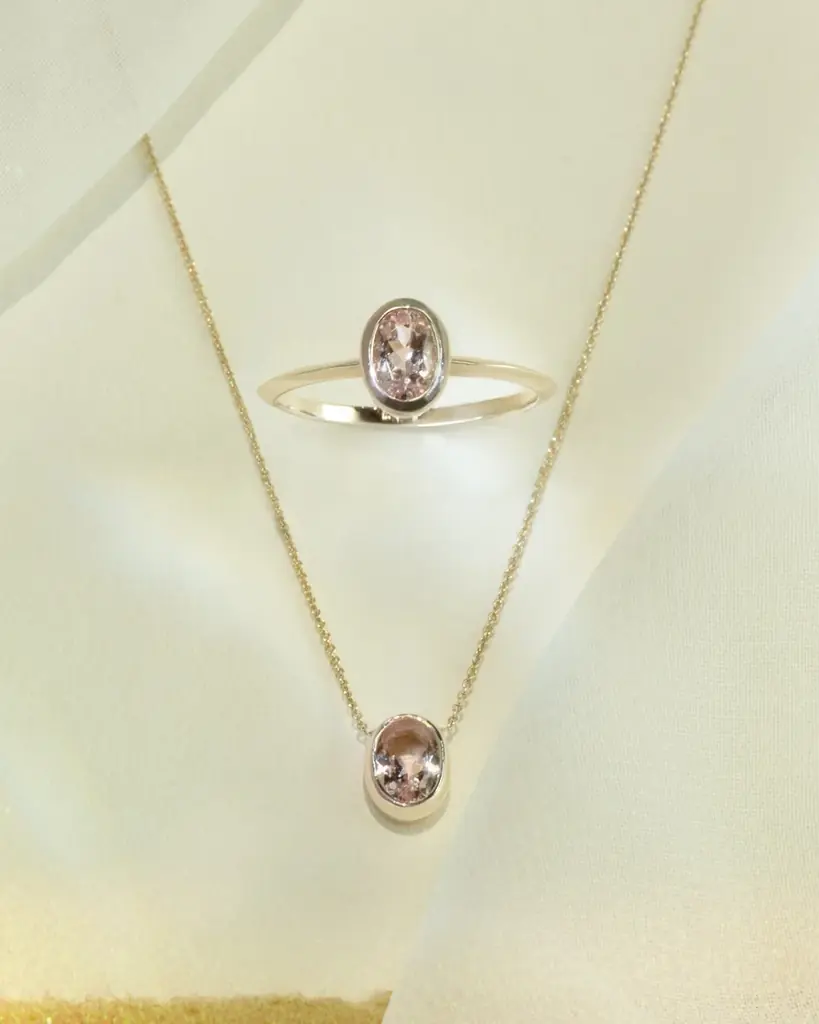 モルガナイトを主石としたアイテムは淡いピンクカラーが特徴で、石留めやアームの細部にこだわった設計が強調されています。小さなダイヤモンドを配したデイリー向けのファインジュエリーはスキンジュエリーとして日常使いを想定してデザインされています。