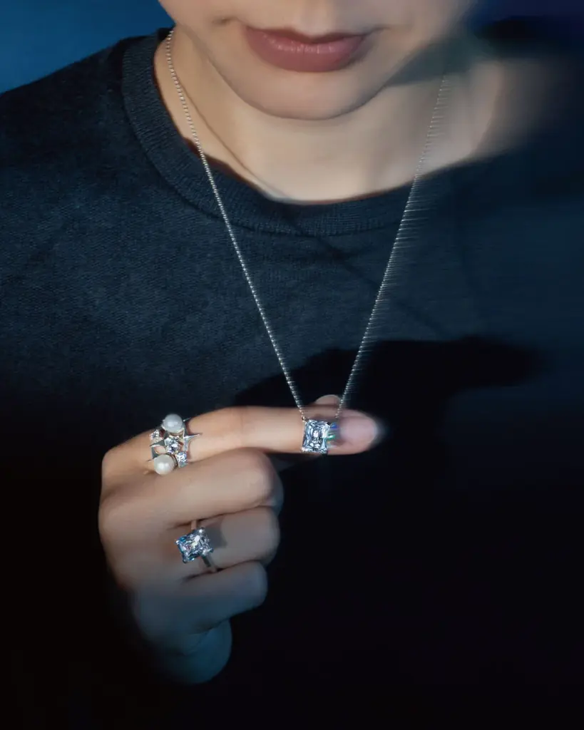 - オクタゴンカットのキュービックジルコニアを用いたリング、ネックレス(ネックレス長さ:約55cm、アジャスター5cm) — ※詳細の個別価格は上記に準ずる表記