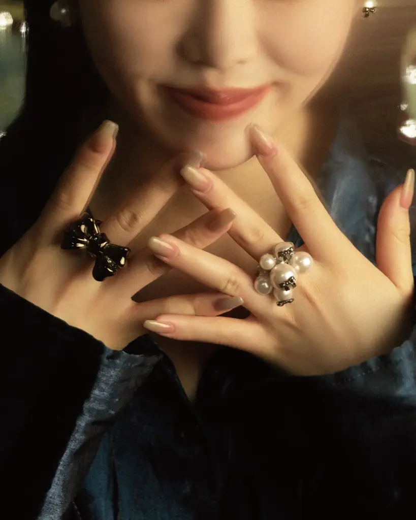 パールとリボンの組合せや、クリアな樹脂にパーツを閉じ込める意匠は、ホリデーシーズンの光の揺らぎやオーナメントを思わせる表現です。アンティーク調のカラーバリエーションで大人のスタイルにも合わせやすいデザイン設計となっています。