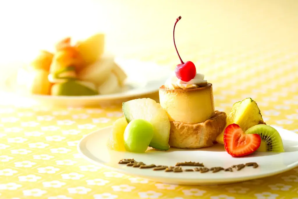 - 上段: プリンアラモード(タカノフルーツティアラオリジナル)。昔ながらの固めの食感で、ホイップクリームとさくらんぼのシラップ漬けをトッピング。