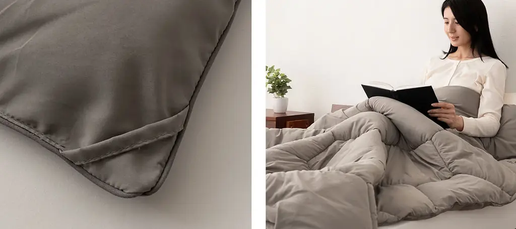 本掛け布団は手洗いによる洗濯が可能で、6か所ループ付きのため掛け布団としての実用性が考慮されています。日常での取り扱いを想定した設計により、清潔に使い続けられる仕様です。