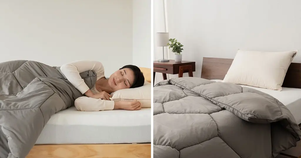 布団の性能は素材だけでなく構造設計にも左右されます。本製品は中わたにグラフェン繊維を40%含むポリエステル中材を採用し、側生地には高密度300Tのポリエステル生地(ピーチスキン加工)を使用しています。