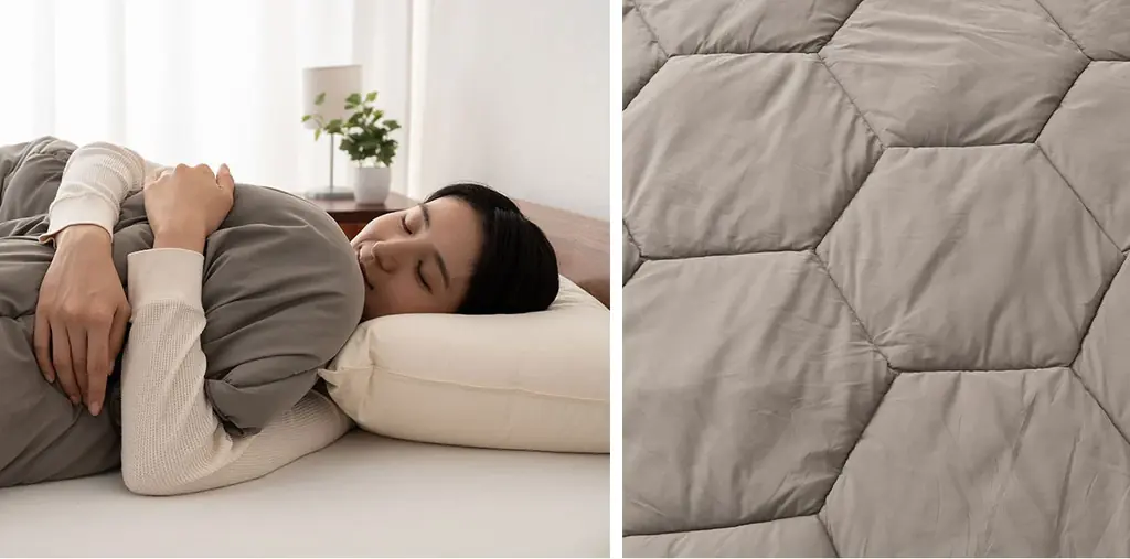 中わたの偏りを防ぐために採用されたのが六角形のヘキサゴンキルティングです。このキルティング加工は中わたを均一に分布させやすく、触れたどの位置でも均一の暖かさが得られるよう設計されています。見た目にも高級感があり、機能性とデザインの両立が図られています。