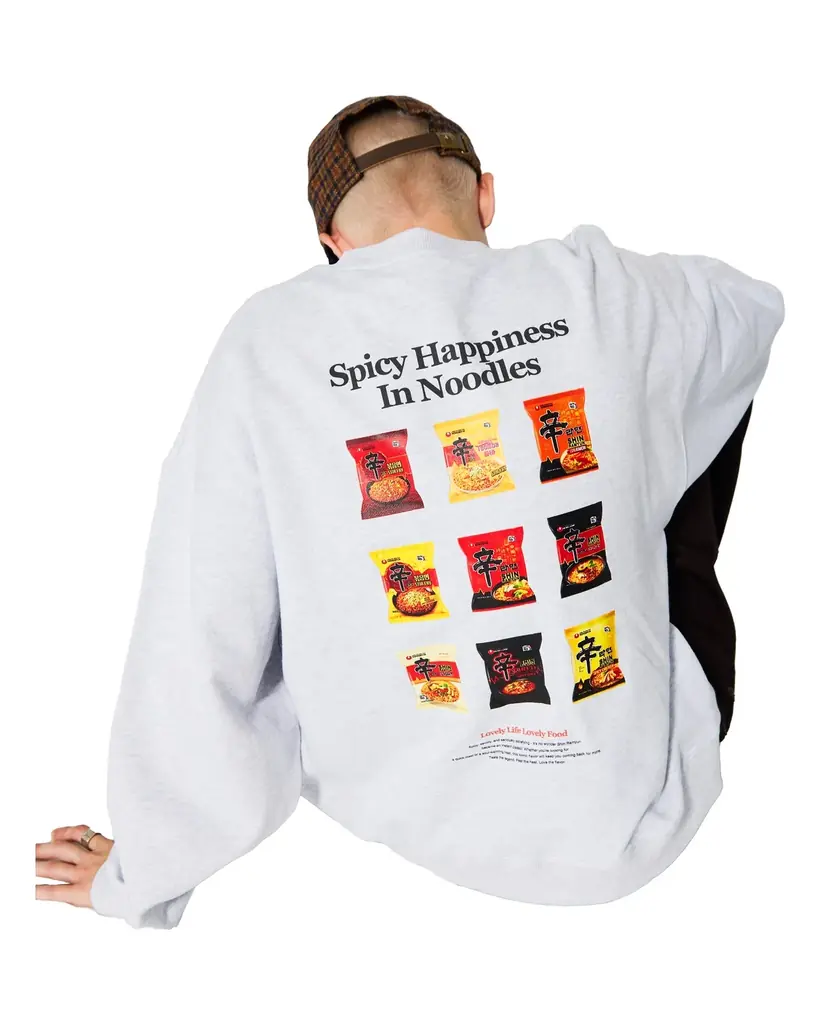 ノルディック柄は秋冬シーズンに合わせた暖かみを持たせつつ、「辛」の文字を組み込むことで辛ラーメンとのコラボレーションを明確に表現しています。スウェットは辛ラーメンのパッケージビジュアルを並べたプリントや、グローバルキャッチコピーを用いることで、商品としての認識性を高めています。