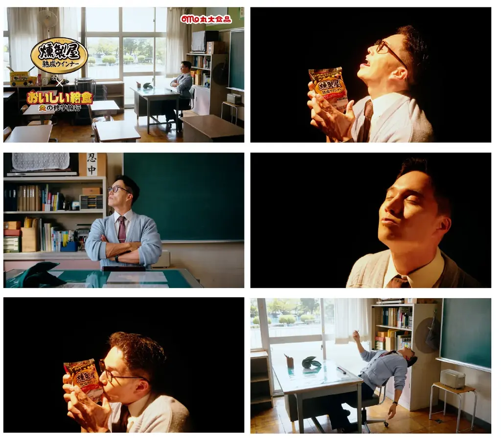 映像は大きく分けてテレビCM(タイアップCM)とWEB動画(TVer、YouTube、Xで配信)に分かれ、劇場(松竹マルチプレックスシアターズ系列、イオン系列)では作品上映前に2週間限定で「香り篇」をシネアドとして放映します。各篇とも演出は給食に深い思い入れを持つ甘利田先生が妄想のような場面でウインナーの調理や味わいを体感的に表現する構成です。