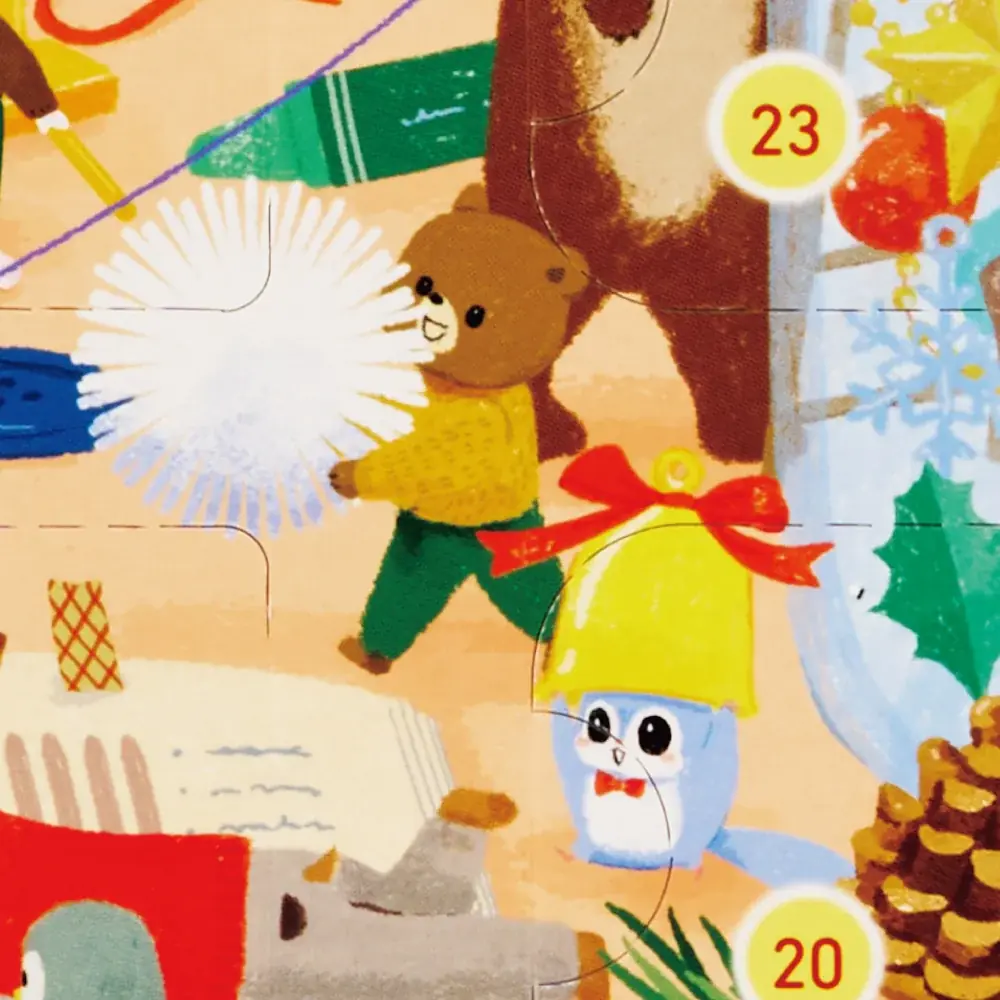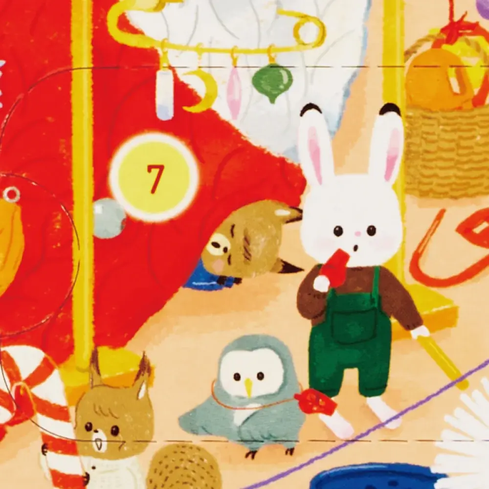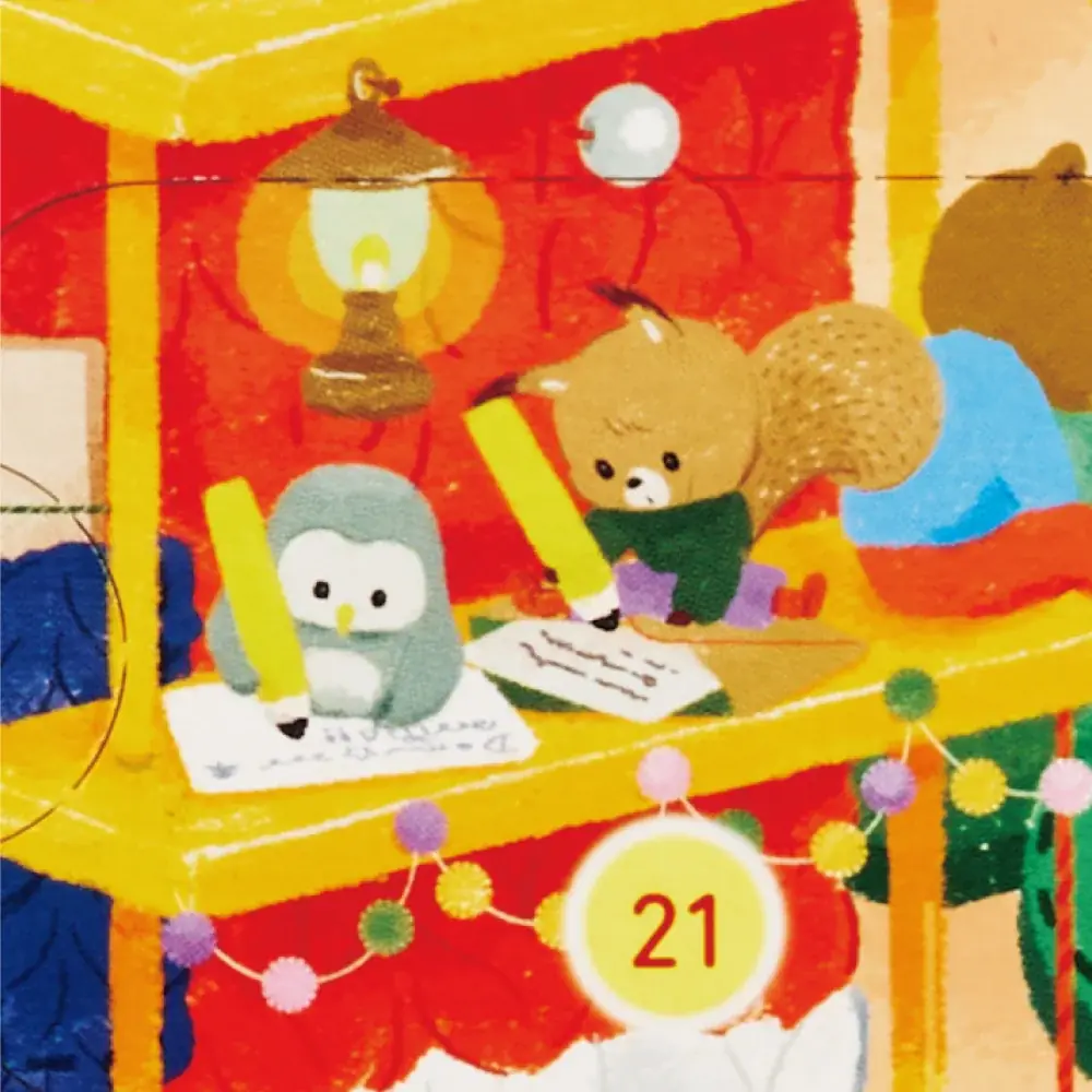 2025年版のアドベントカレンダーのイラストテーマは「待ち遠しいクリスマス!みんなで靴下を編もう!」です。今回のイラストは、小さな動物や妖精たちが協力して大きな靴下を編み、飾り付けを進める場面が描かれています。