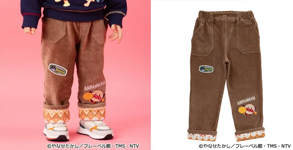裾にノルディック柄の折り返しが入ったニットコール素材のパンツです。アンパンマンは刺繍で表現され、ばいきんまんのワッペンがアクセントとして付属します。裾は折り返し仕様で丈の調節が可能なため、お子様の成長に合わせて長く着用できます。