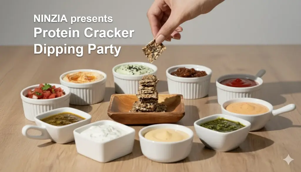 「ストイックすぎるプロテインクラッカー」を複数のディップで試食可能。主原料は蒟蒻ペースト・オーツ麦・パンプキンシードで、1袋50gあたりタンパク質10.1g、食物繊維7.35g、香料・人工甘味料不使用です。