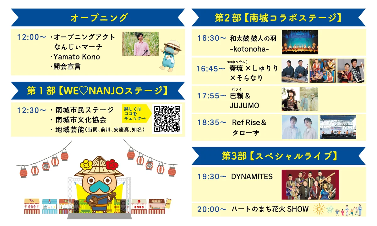 DYNAMITESの19:30スペシャルライブ、Ref Rise&タローずの18:35親子共演、夜のハートのまち花火ショーに加え、南城ガストロノミーやハーブマルシェなど食と体験企画が楽しめます。