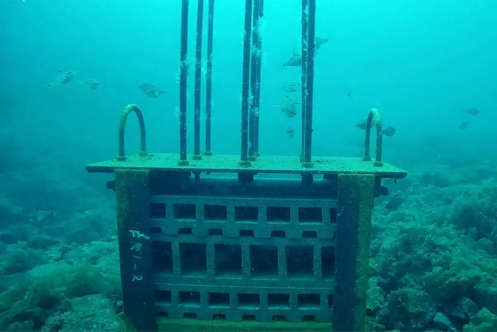 水産資源保護の取り組みとして、公益財団法人 日本釣振興会の支援のもと、2025年夏に向山岸壁と網屋崎岸壁に人工魚礁を設置しました。設置後1か月の水中ドローン確認では、ネンブツダイやメジナの群れ、クロダイやフエダイなどの中型魚、クエ・オオモンハタなどの根魚が観察され、魚礁としての成育に期待が寄せられています。
