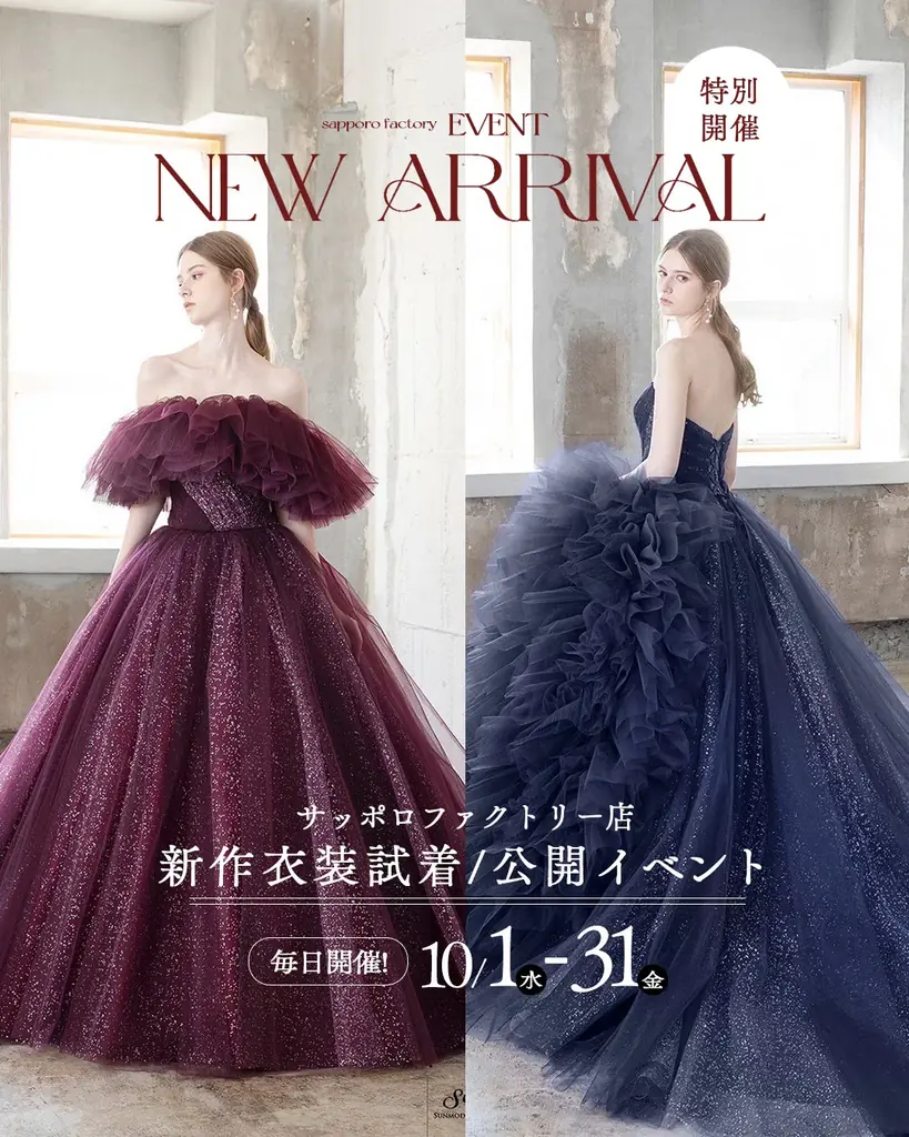 2025年10月の土日祝限定で札幌エリアの店舗で開催。ドレス試着やカウンセリングが受けられるので、来店予約をして希望日時を店舗(電話かメール)に伝えてください。