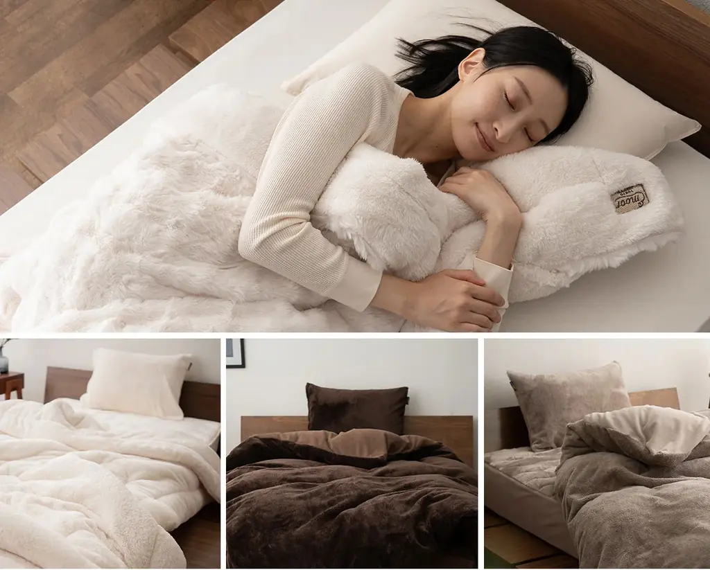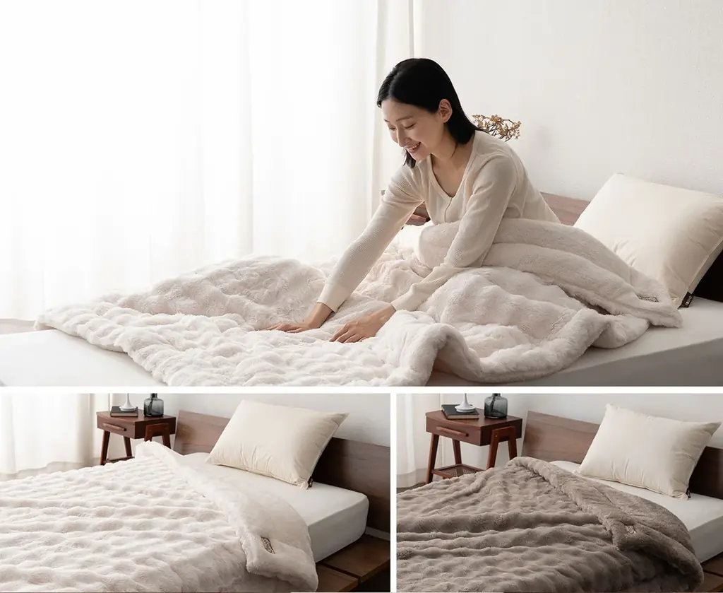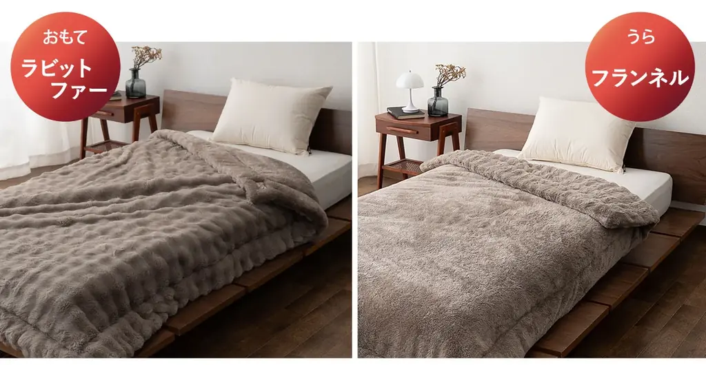 リバーシブル仕様のため、表裏をその日の好みや室内の温度に合わせて使い分けることができます。とろふわのラビットファー側とやわらかなフランネルボア側の双方で、寝室のテイストに合わせたコーディネートが可能です。