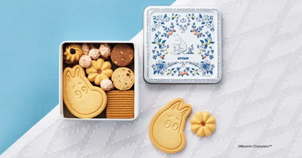 ムーミンとリトルミイのデザインを施した缶入りクッキーが2種類用意されています。ムーミンのフェイス型クッキーは見た目の愛らしさが特徴で、食後は小物入れとして再利用できます。