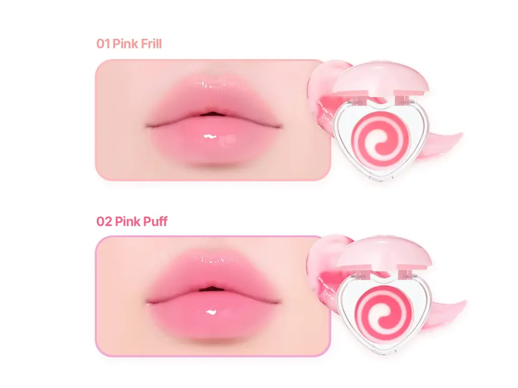 キャンディローリングポット(Candy Rolling Pot) 6g 1,980円 01 ピンクフリル、02 ピンクパフ(全2色) スワール模様のパッケージ、保湿成分配合、専用ミニシリコンブラシ付属