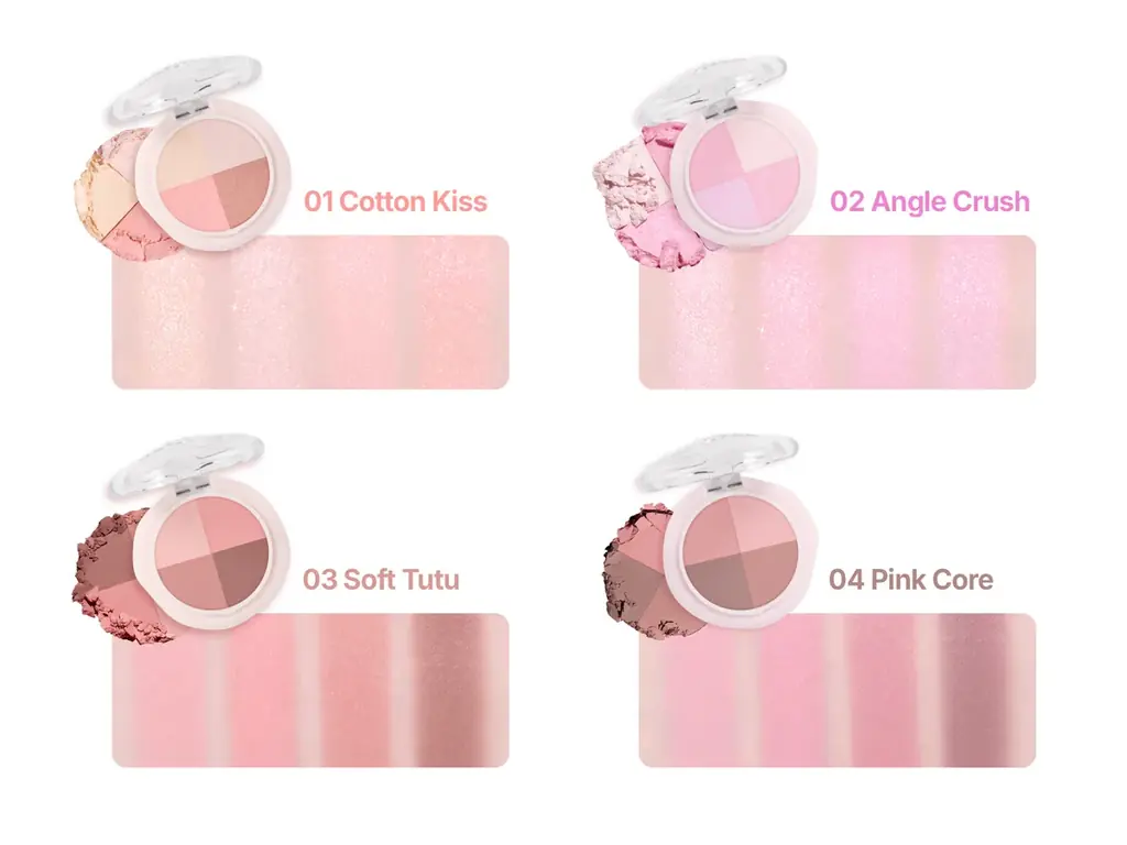 4色で構成されたコンパクトパレット。手のひらサイズで携帯性に優れ、涙袋や目元のポイントメイクだけでなく、ハイライトやチークとしても使用可能です。