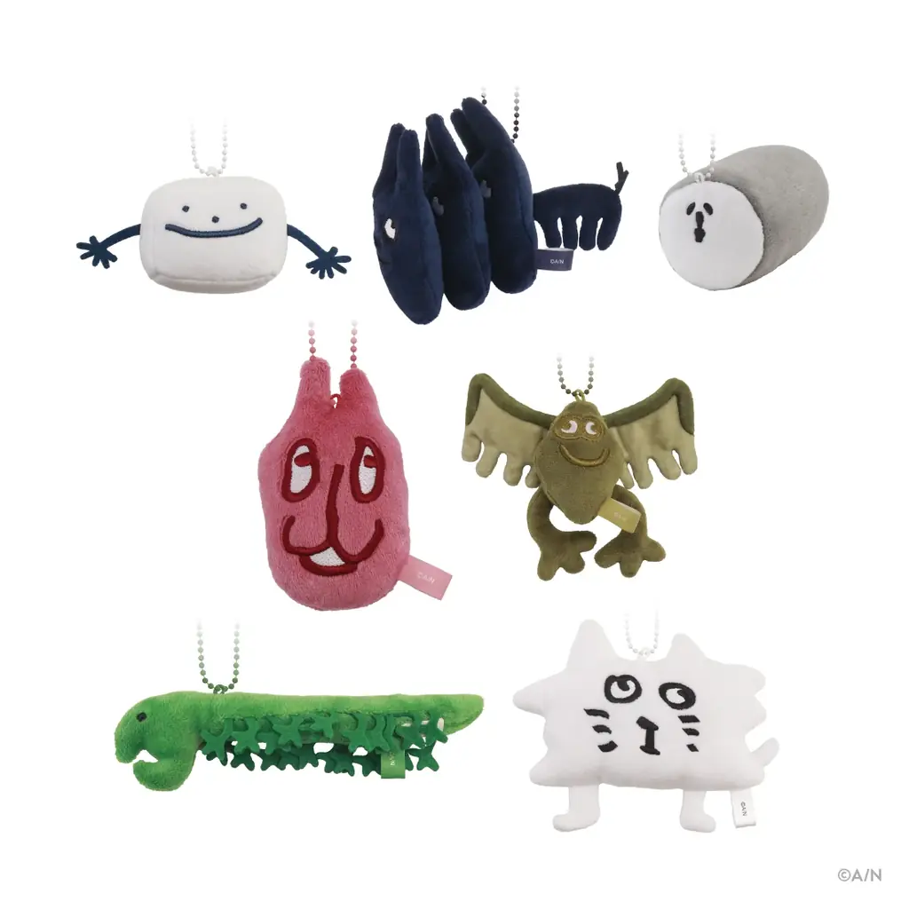魔物マスコット 各2,200円 全7種 へーベル石田:W130×H50×D50mm、キンタロウ:W55×H55×D95mm、ケルベロス:W40×H100×D130mm、ナギ:W50×H40×D160mm、フライナゲット:W130×H120×D30mm、うさじ:W55×H95×D30mm、ねご:W110×H110×D35mm ポリエステル お1人様1会計につき各5点まで