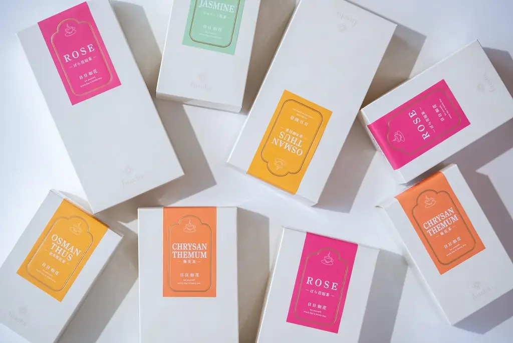 fuachaは花の美しさと果実の滋味を組み合わせた花茶・果茶を中心に展開しています。今回のポップアップでは、看板商品であるばら花冠茶®をはじめ、金木犀(キンモクセイ)花茶、ジャスミン花茶、菊花茶、そして果茶を含む複数の種類が並びます。