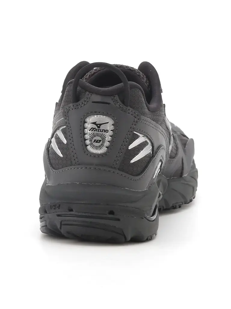 特徴:ミズノのランニングシューズ『WAVE RIDER 10』をベースにしたコラボレーションモデルです。ブラックのワントーンに透け感のあるメッシュアッパーを採用し、ヒールにはWAVE RIDER 10とemmiの10周年を組み合わせた「10ロゴ」を配しています。左右非対称のインソール、シルバーのヒールパーツ、イエローのサイドロゴなど、モード性と遊び心を併せ持つデザインです。