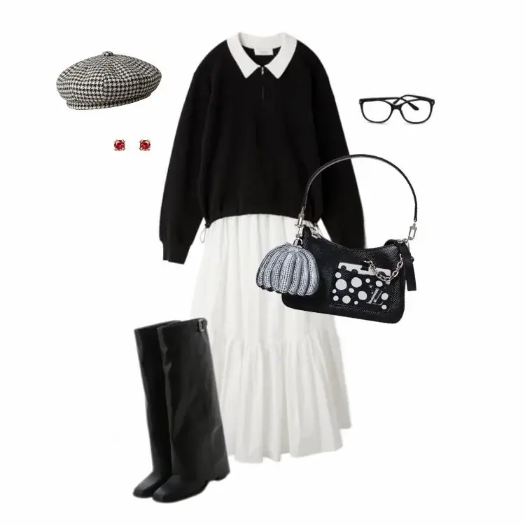 コーディネート例としては、白のティアードロングスカートに黒の襟付きプルオーバー、黒のニーハイブーツ、千鳥格子のベレー帽、黒縁メガネというモノトーンの組み合わせが紹介されています。アクセントに鮮やかなレッドのピアスを一点投入することで、ハロウィンカラーを上品に取り入れる提案です。