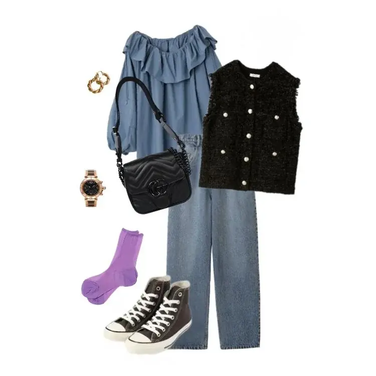 紹介されたコーディネートは、フリルブラウスとワイドデニムにパールボタンの黒のツイード調ジレ、ハイカットスニーカーを合わせたミックススタイルです。足元に覗かせるミステリアスなパープルのソックスがハロウィンらしさを控えめに加える工夫として挙げられています。