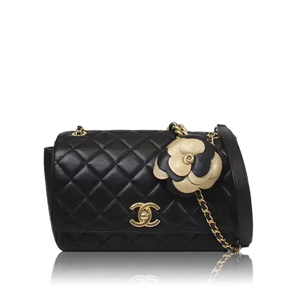 シャネルの「カメリアチェーンショルダーバッグ」は、キルティングとチェーンにカメリアのコサージュが添えられたフェミニンでラグジュアリーなバッグです。持つだけで装いを格上げする存在感が強調されています。