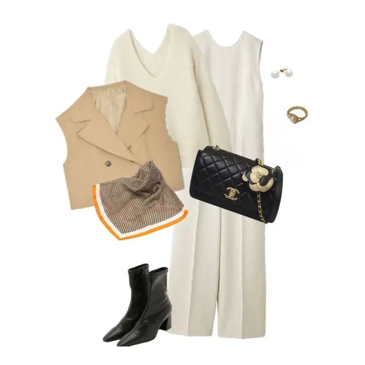 コーディネート例はオフホワイト〜ベージュのワントーンレイヤードで、ニットやベストを重ねて奥行きを出し、黒いアンクルブーツで引き締めるスタイルが示されています。小物のスカーフにはオレンジの縁取りが施され、首元やバッグに結ぶことでハロウィンのメインカラーを落ち着いた形で取り入れる提案です。