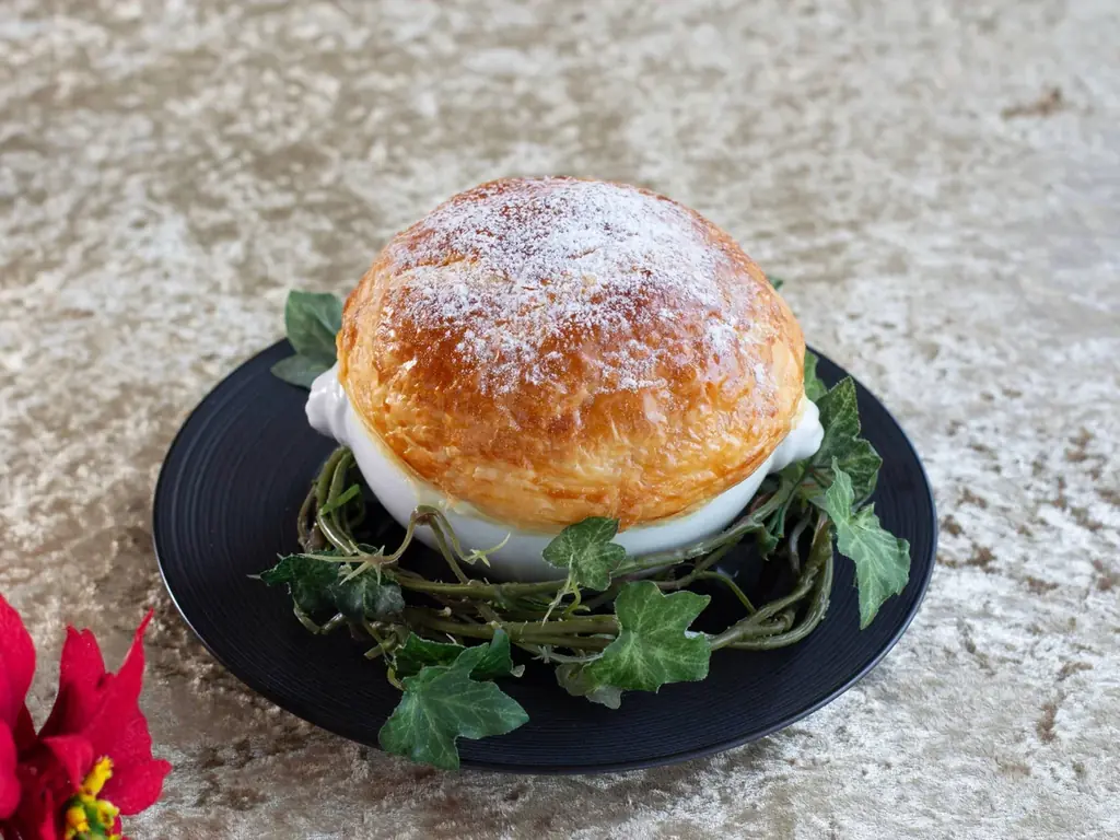 スペシャルディッシュはクラムチャウダーのパイ包み焼きです。熱々のクラムチャウダーの旨みと香りをサクッとしたパイ生地で閉じ込め、丁寧に焼き上げます。提供時にはスタッフが目の前でパウダーをふりかけ、雪が舞い降りるような視覚的な演出を行います。