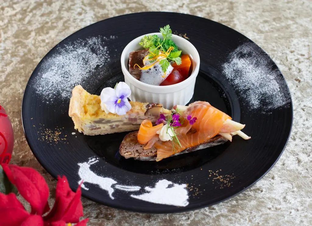 - 3段目(手前から左回り):自家製スモークサーモンのタルティーヌ、栗と茸のキッシュ、牛肉のブルギニョン(赤ワイン煮込み)。クリスマスパーティーの食卓をイメージしたセイボリーが揃います。