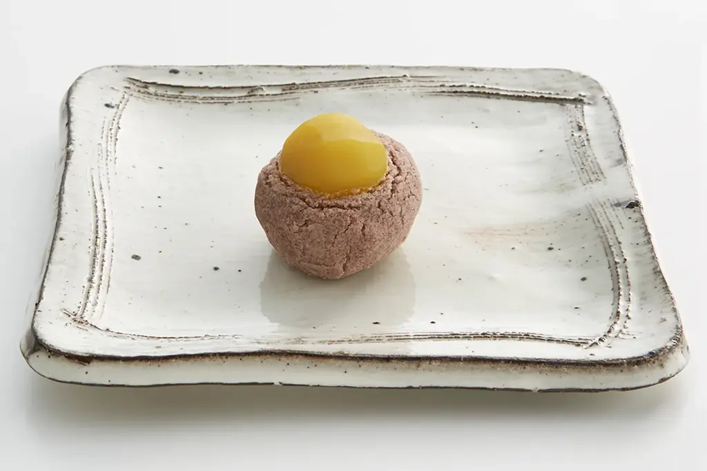 「栗名月」は中秋の名月から約1か月後の十三夜に合わせた歳時菓子として、2025年11月2日限定で販売される品。小豆の時雨生地(しぐれ)で黄味餡を包み、蜜漬けの栗を一粒のせることで、十三夜に見立てた風情ある姿に仕上げられている。生地の口どけと栗の味わい、食感のバランスが設計されていることが特徴だ。