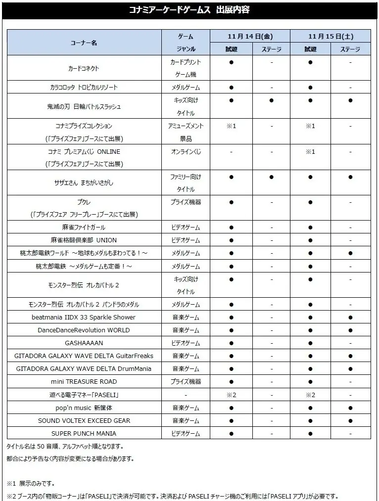 コナミアーケードゲームスが公開した情報には、会場での試遊やステージ配信に関する注意点が明記されています。特に試遊可能な筐体やゲーム内容については開発中のものが含まれる点が注記されています。