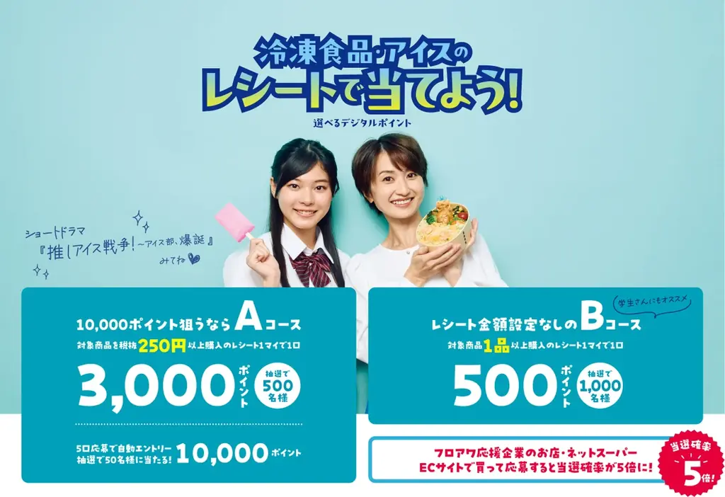 | キャンペーン(レシート)賞品 | Aコース(250円以上):3,000ポイント(500名)/1万ポイント(50名・5口応募)、Bコース:500ポイント(1,000名) |