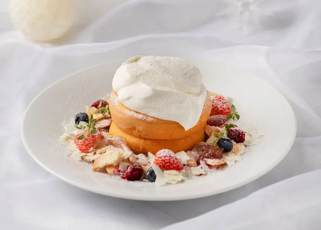 • イシヤパンケーキ ~White Christmas~:1,800円(税込) — ラング・ド・シャやゼリーなど複数の食感を合わせたホワイトクリスマスイメージのパンケーキ。