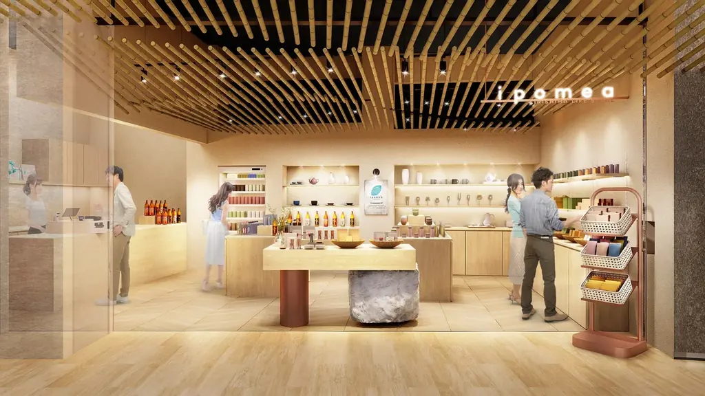 施設内に出店する霧島酒造の直営店舗は「KIRISHIMA LIFE STORE ipomea(キリシマ ライフ ストア イポメア)」と命名されました。店名の「LIFE STORE」は日々の暮らしの幸せを支えるアイテムを届けたいという想いに由来し、後半の「ipomea」はさつまいもの学名であるIpomoea batatas(イポメア バタータス)に由来しています。