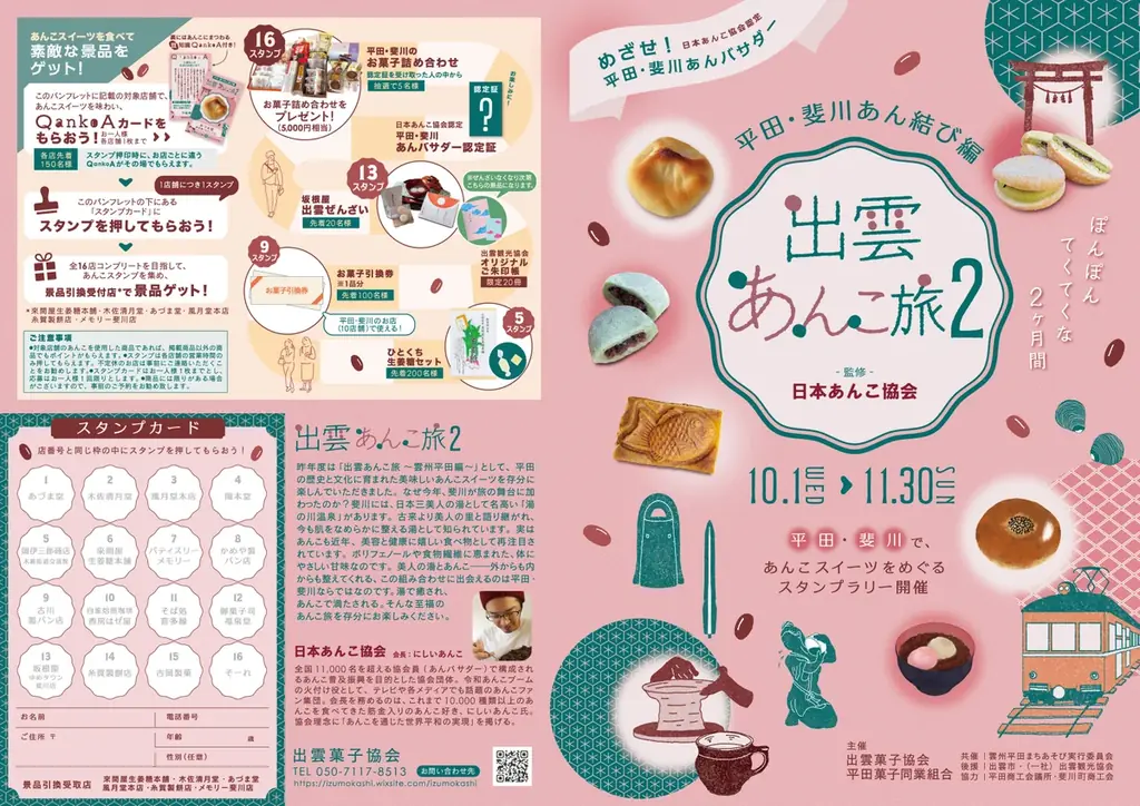 | 出雲あんこ旅2 | 開催期間:2025/10/1~11/30、対象:16種、主催:出雲菓子協会・平田菓子同業組合、監修:日本あんこ協会 |