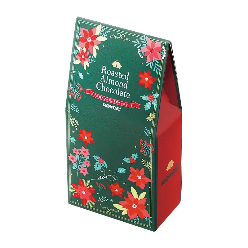 ドイツのクリスマスマーケットで親しまれている「焼きアーモンド」をロイズ流にアレンジした商品です。アーモンドをローストしてキャンディング(飴がけ)し、カリっとした食感にしたのちミルクチョコレートで包み、さらにココアパウダーをまぶす工程で仕上げています。
