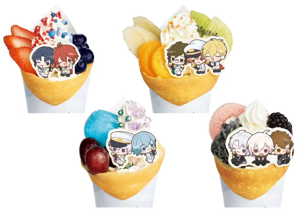 販売されるコラボクレープは、IDOLiSH7とTRIGGERのメンバーをイメージした4種のラインナップです。各クレープは見た目と味の両面でキャラクター性が表現されており、プリント最中やカラーシュガー、トッピングなど随所に工夫が施されています。