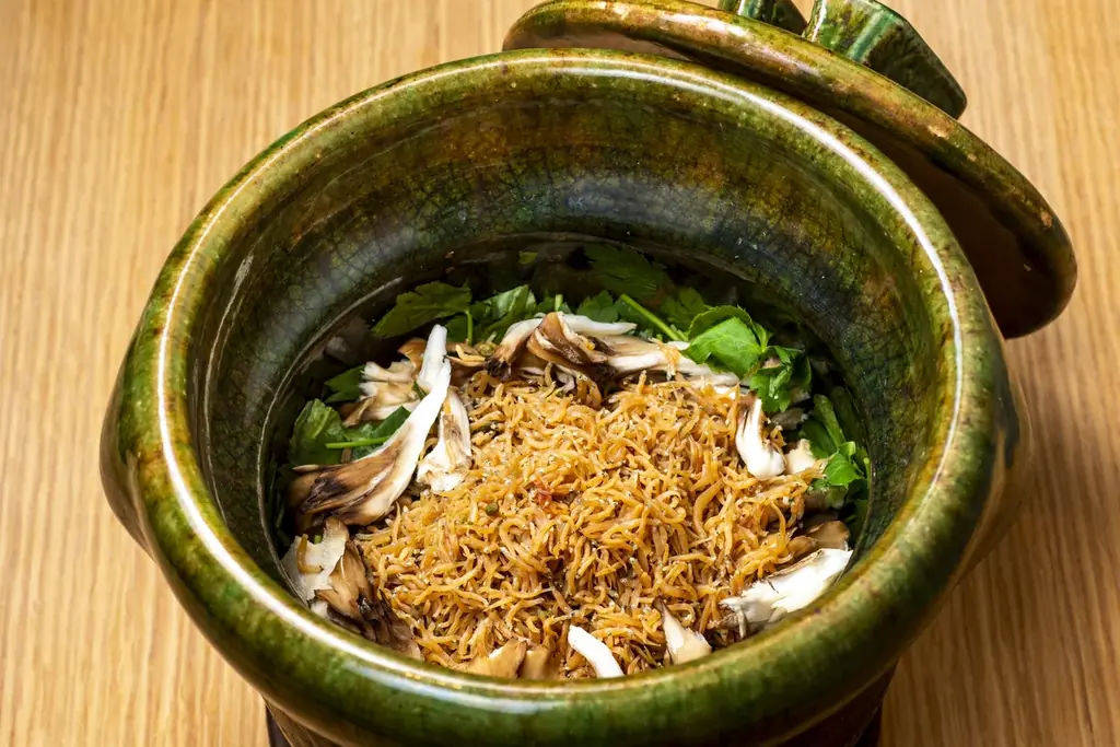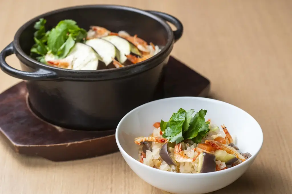 提供例: 折戸なすと桜えびのだし炊き込み御膳。ランチ御膳 2,420円(御膳のみ)、ディナー御膳 3,250円、だし炊き込みご飯 単品 1,820円(数量限定)。