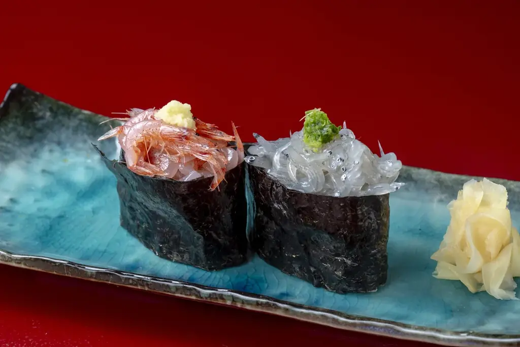 提供例: 生桜えびの軍艦巻 440円、生しらすの軍艦巻き 440円。秋漁の新鮮な生桜えび、吉田町産の生しらすを江戸前寿司で提供。