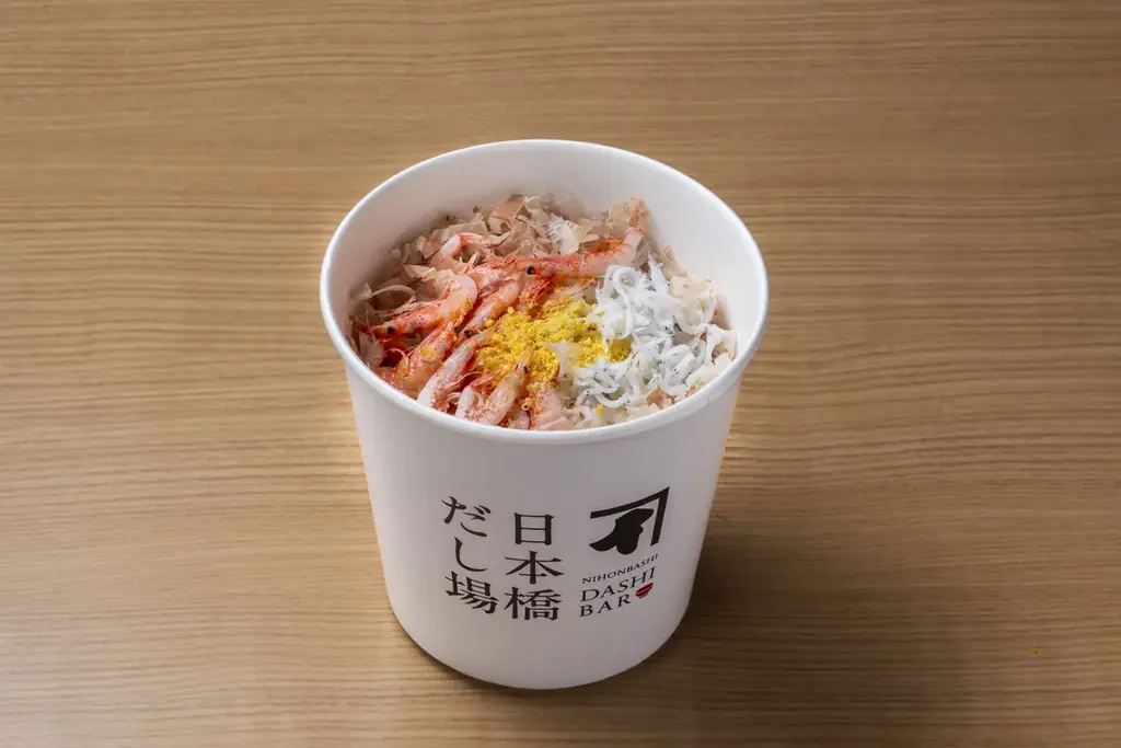 提供例(テイクアウト): しらす桜えびのせ かつぶしめし 550円(販売時間 11:00~14:00)。釜揚げしらすと桜えびを合わせ、川根本町産の柚子の香りを活かす。