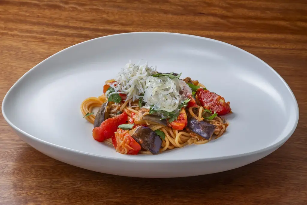 提供例: スパゲティ(2種のしらすと折戸なす・レッドオーレのトマトソース)、パンナコッタとミルクジェラートにオリーブオイルとハチミツをかけて。Lunch プリフィックス 4,600円、シェフお任せスペシャルランチ 7,000円、Dinner コース 9,900円等。