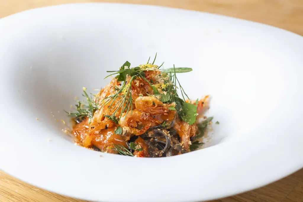 提供例: 駿河湾生桜えびのビスクソース イカ墨のリングイネ(コース提供)。Lunchコース 6,600円(サービス料別途10%)、Dinnerコース 13,200円(サービス料別途10%)。
