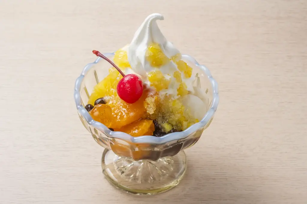 提供例: 榮太樓あんみつパフェ ゆず蜂蜜 770円。島田市産の天然はちみつと川根本町産の柚子を合わせた「ゆず蜂蜜」をトッピングしたあんみつパフェ(イートインのみ)。