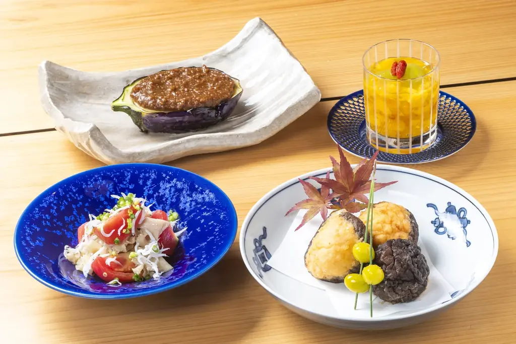 提供例(コース内の一品): 折戸なすの味噌田楽、桜えび・折戸なす・銀杏のかき揚げ、ホホホタケと自然薯と柚子の柚香煮、レッドオーレトマトのジェラート。