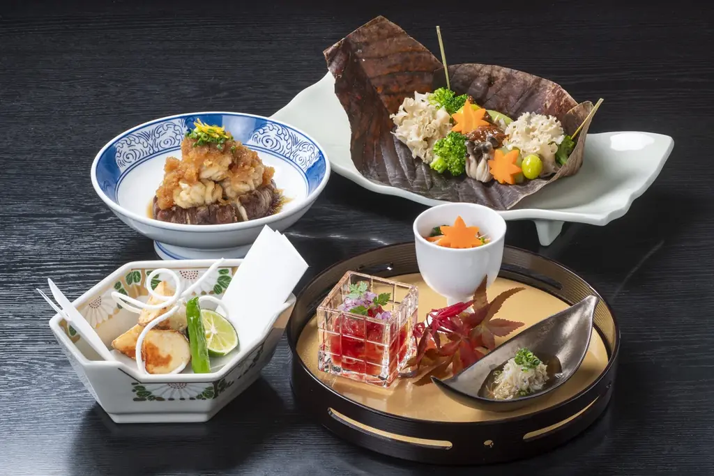 提供例: 昼の会席 6,600円・9,900円・13,200円、夜の会席 18,700円・24,200円・30,800円。藤枝市の生しいたけ「富富」をしんじょにして清水特産の銀杏を添えるほか、折戸なすの田楽、しらす・トマト・ホホホタケのドレッシング仕立て、柚子のゼリー寄せなど。