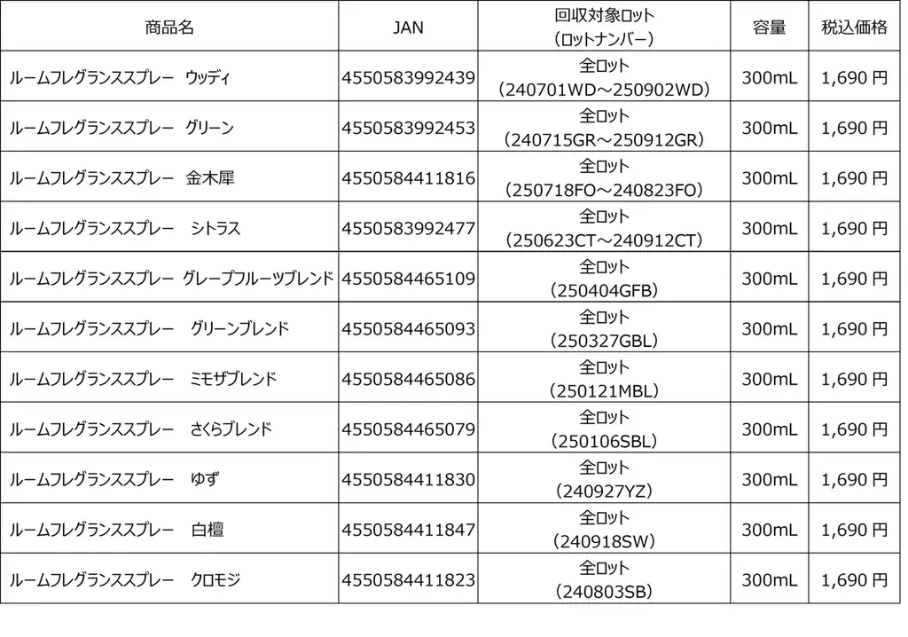 | 対象商品 | 2024年9月以降に発売された「ルームフレグランススプレー」の一部商品。さらに当該商品と同一工場で製造されたルームフレグランススプレー全てを回収対象とする。 |