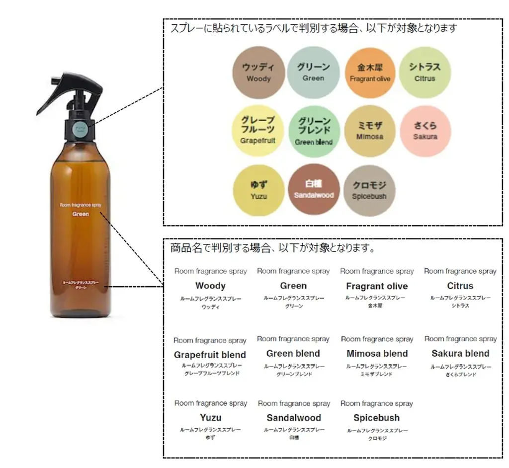 良品計画の発表は、回収対象に関する項目を複数設けています。報道資料中の見出しは「回収対象商品」「商品外観」「対象外商品」となっており、今回の回収は当該工場で製造されたルームフレグランススプレー全てが対象であることが明記されています。