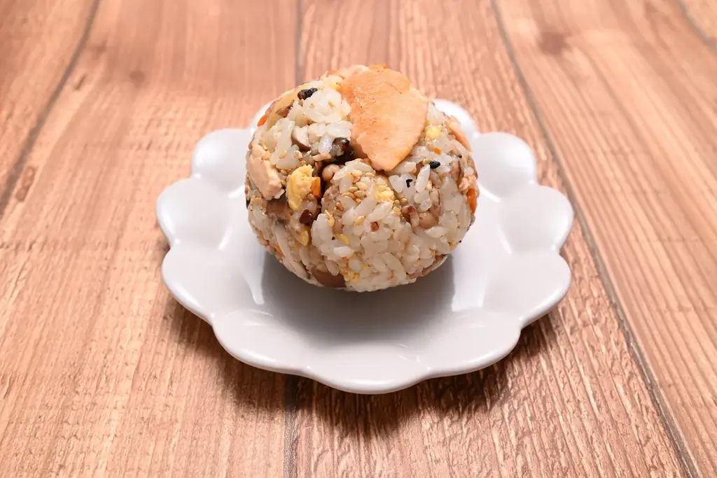 丸形に握ったおにぎりの上には鮭のほぐし身を配し、にんじんやごぼうなどは規格外野菜や廃棄予定の野菜を活用して食品ロス削減へも配慮。ゴマのプチプチした食感と風味をアクセントに加え、地域間のつながりとサステナブルな視点を両立しています。