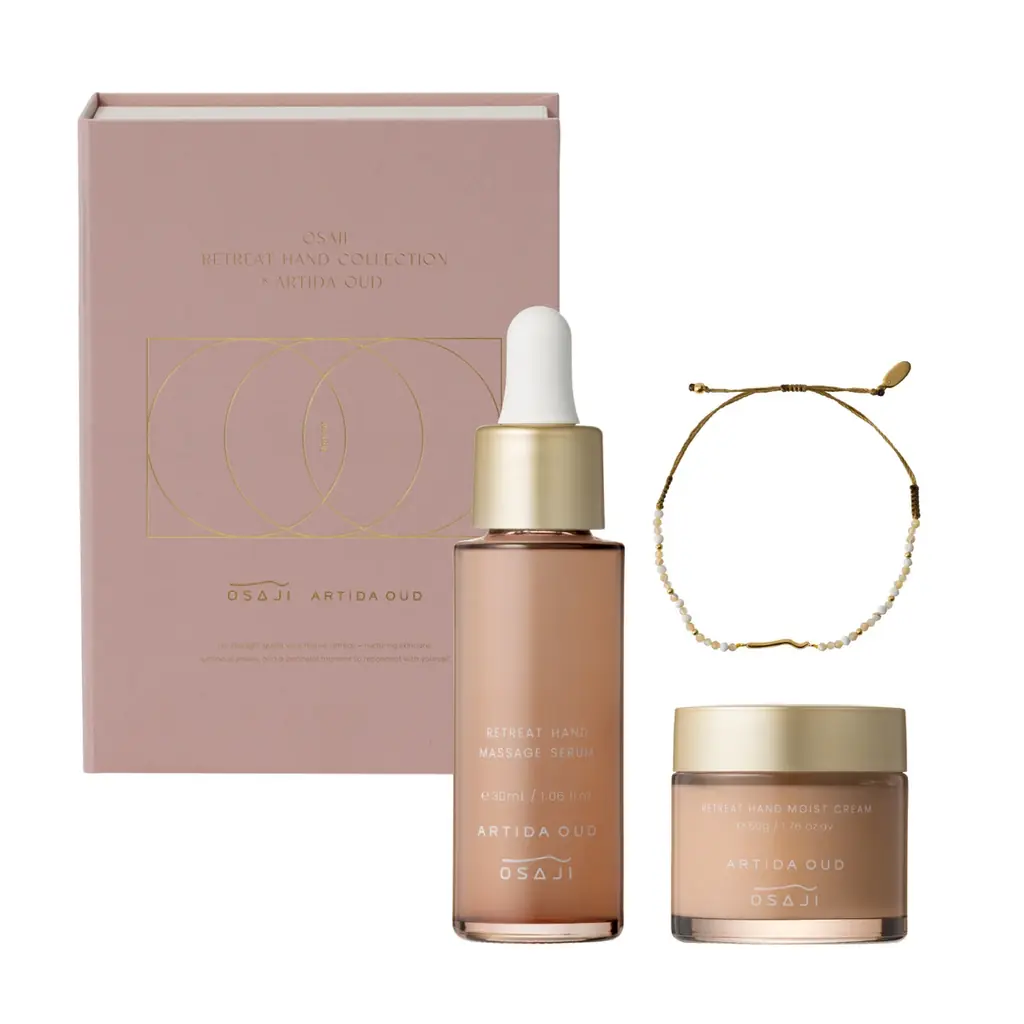 両ブランドの協働により誕生したこのセットは、OSAJIの人気ハンドケアラインを中心に、ARTIDA OUDがデザイン監修と香りの調香を行った限定仕様で提供されます。限定パッケージと、OSAJIロゴをモチーフにしたチャームを配した天然石ブレスレットが同梱され、ホリデーシーズンの贈り物や自分へのご褒美として設計されています。