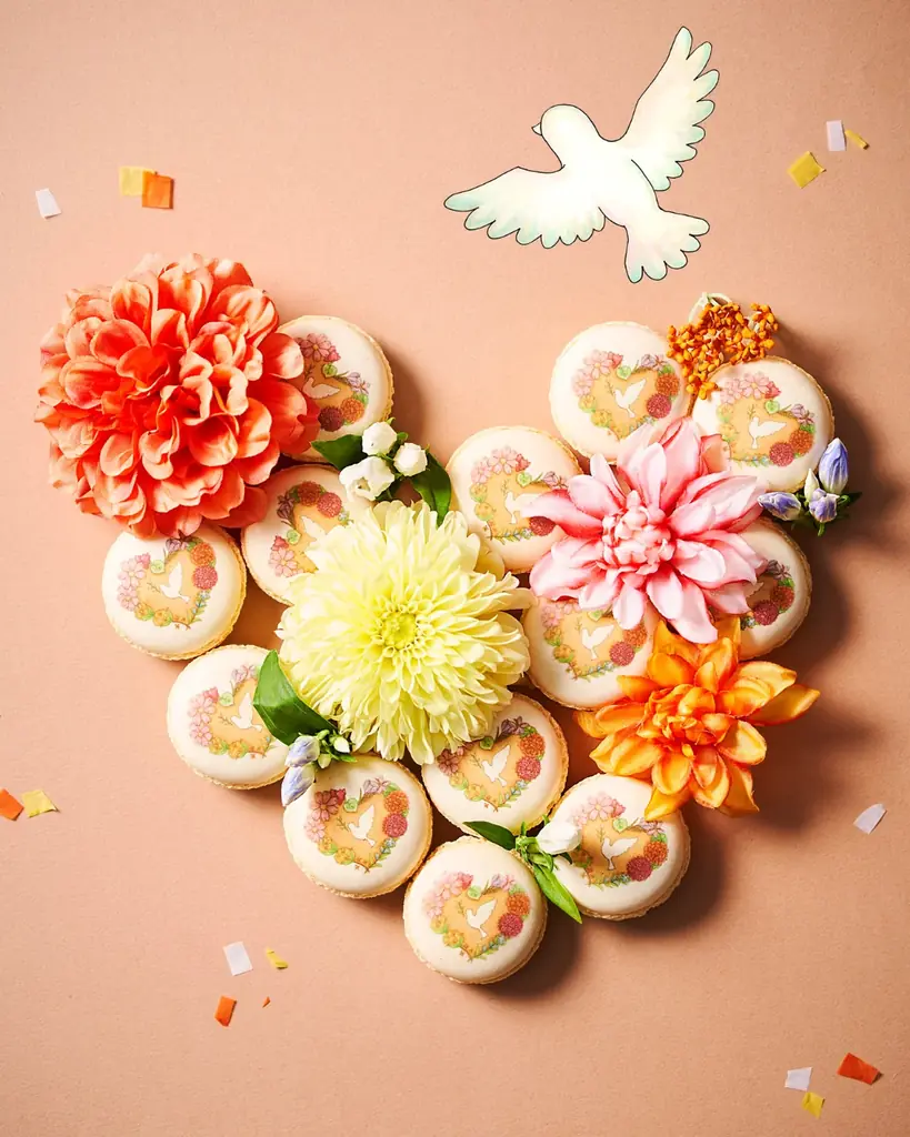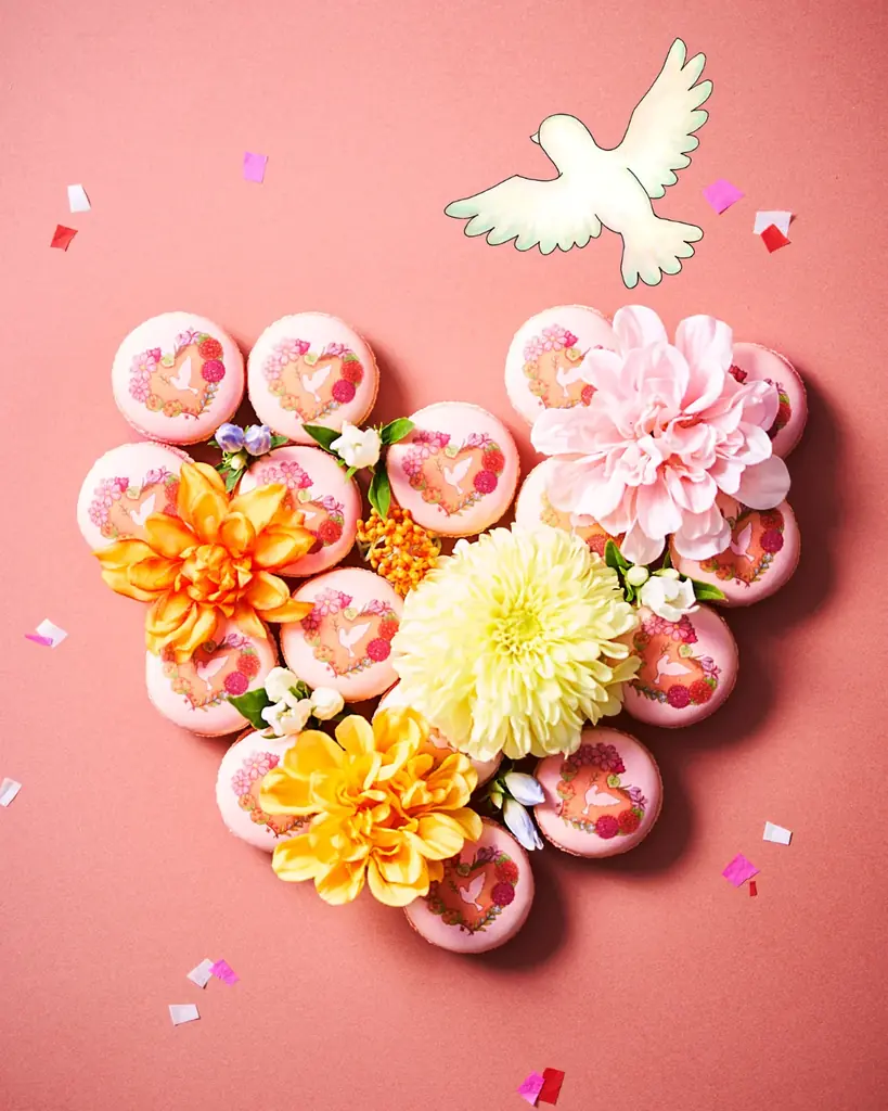 マカロンのハート形に並べられた花々は、見た目の美しさだけでなく、それぞれが持つ花言葉を通じて多様性や感謝、誠実さ、希望といった価値観を伝えます。白い鳩は中央で平和とつながりを象徴し、色彩は季節特有の光や風景を連想させることを意図しています。