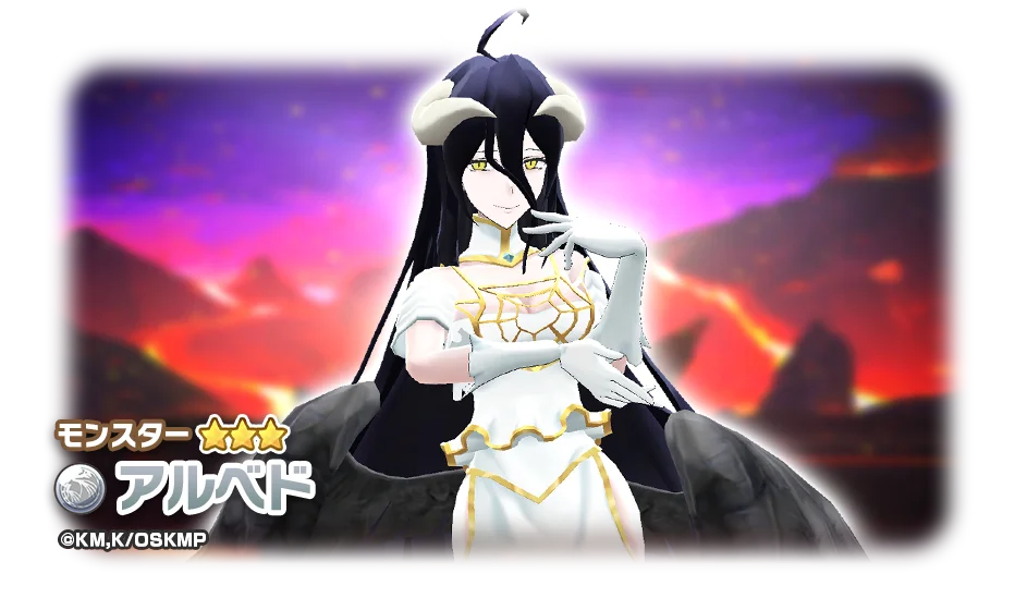 | モンスター(★3) | ウンディーネ種「アルベド」 | 純白のドレスと美しい黒髪が特徴のウンディーネ種。バトルではクールに立ち回るが、アインズの姿が刺繍された抱き枕を宝物とする設定。 |